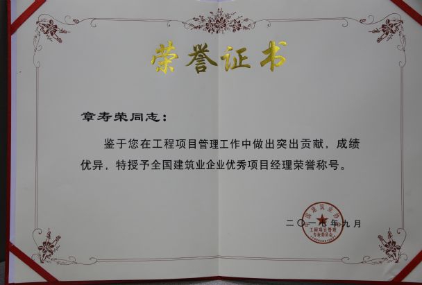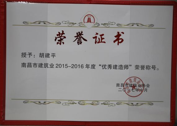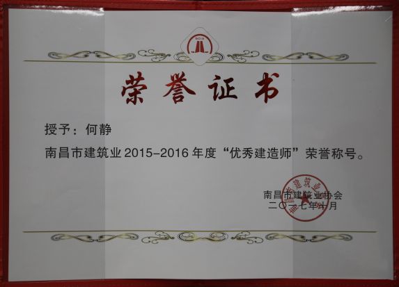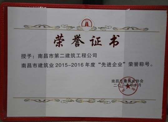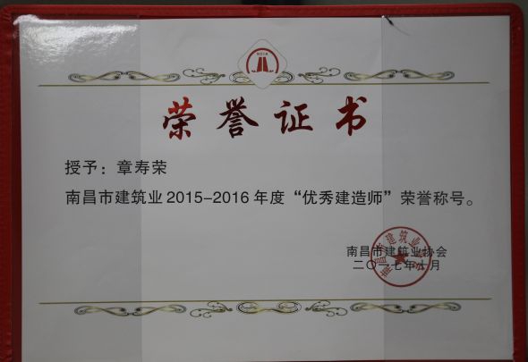 南昌市建筑業(yè)協(xié)會對公司頒發(fā)了南昌市建筑業(yè)2015-2016年度“先進(jìn)企業(yè)”榮譽(yù)稱號,對公司建造師章壽榮、何靜、胡建平、高波頒發(fā)了南昌市建筑業(yè)2015-2016年度“優(yōu)秀建造師”榮譽(yù)稱號;中國建筑業(yè)協(xié)會對章壽榮頒發(fā)了全國建筑業(yè)企業(yè)優(yōu)秀項(xiàng)目經(jīng)理榮譽(yù)稱號。