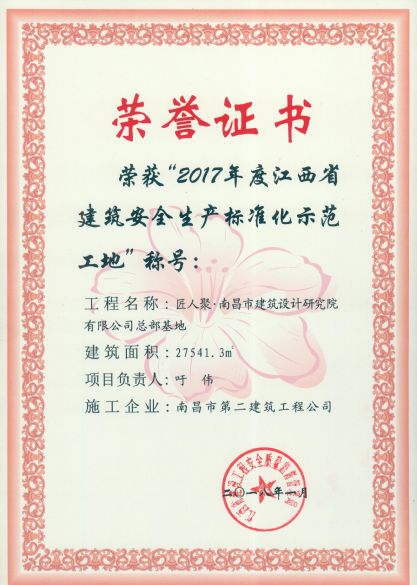 公司承建的郭家莊地塊棚戶區(qū)改造項目(安置房)工程、匠人聚.南昌市建筑設計研究院有限公司總部基地榮獲2017年度江西省建筑安全生產(chǎn)標準化示范工地稱號。