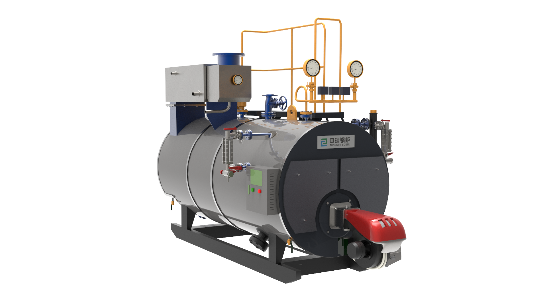 中瑞蒸汽鍋爐為機(jī)電一體化設(shè)備,它由鍋爐本體、燃燒器、電控柜、給水泵及管路閥門儀表等組成。機(jī)組配套了歐洲原裝進(jìn)口燃燒器,機(jī)組本體采用了臥式內(nèi)燃三回程濕背式的成熟結(jié)構(gòu)形式,燃料(油/氣)從燃燒器經(jīng)壓力霧化高速噴出,在爐膽內(nèi)呈微正壓燃燒,燃燒后的高溫?zé)煔庠跔t內(nèi)輻射換熱后轉(zhuǎn)向進(jìn)入第二回程煙管到前煙箱,再折轉(zhuǎn)180o度進(jìn)入第三回程煙管,經(jīng)后煙箱、冷凝器再排入煙囪進(jìn)入大氣。